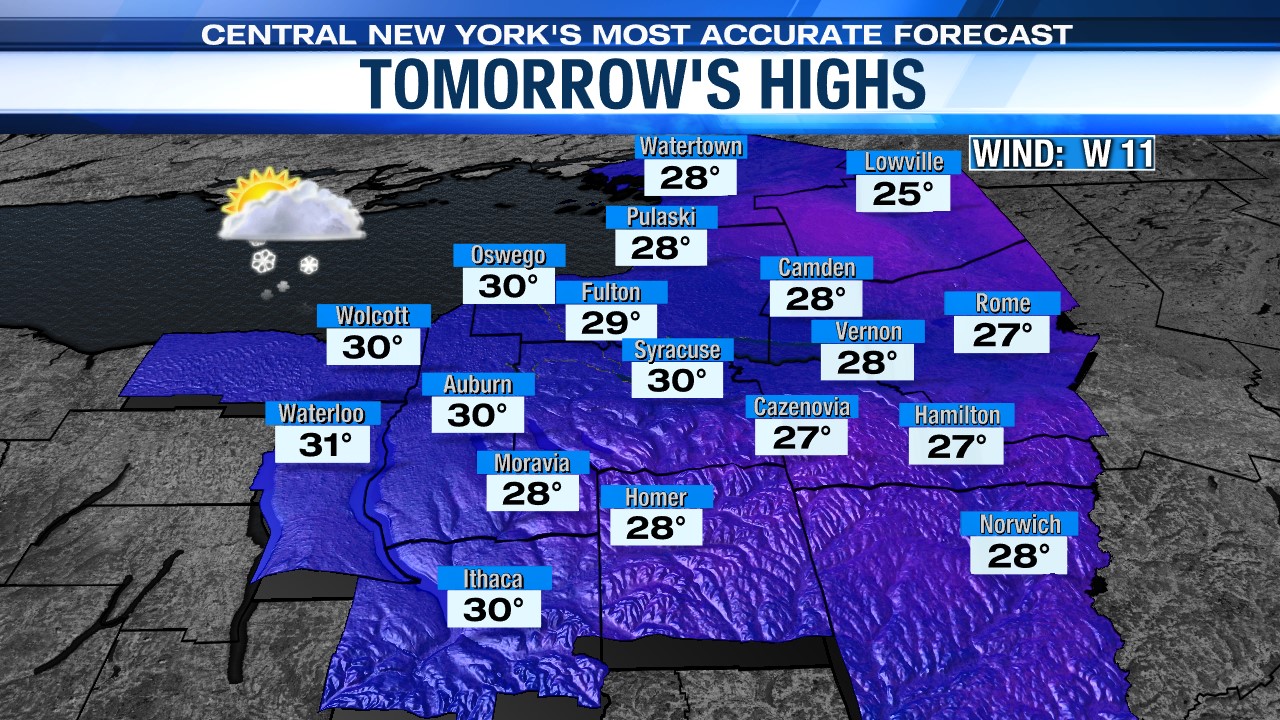 There may be some snow showers around Syracuse near sunrise, but that snow is quickly lifting north. Most of CNY is quiet with some breaks of sun.