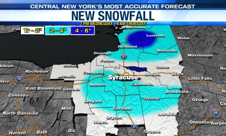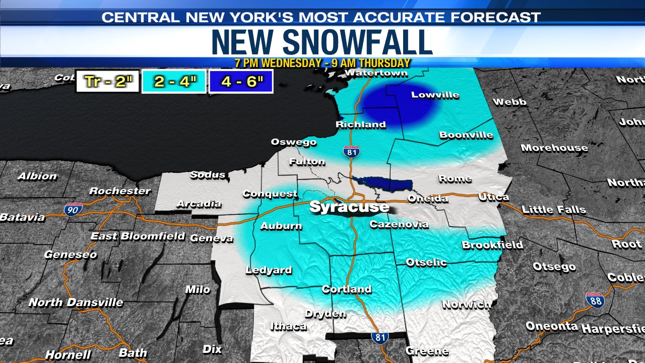 Another coating to as much as an inch or two of fluffy snow could fall Thursday morning south and southeast of Lake Ontario, especially in the hills south of Syracuse. Any lake effect snow showers taper off during the midday/afternoon.