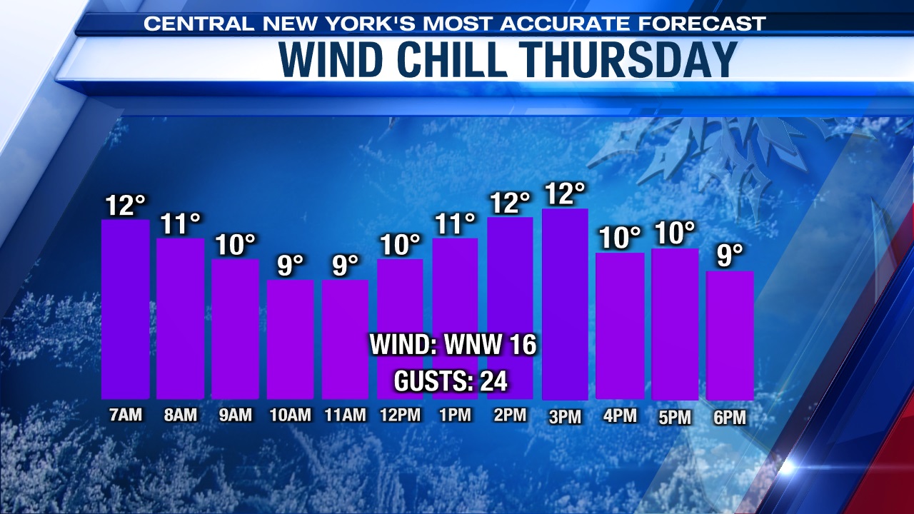 Temperatures drop into the teens to near 20 by daybreak Thursday with a gusty wind sending wind chills down into the single digits at times. Temperatures don’t rise much at all in the afternoon.