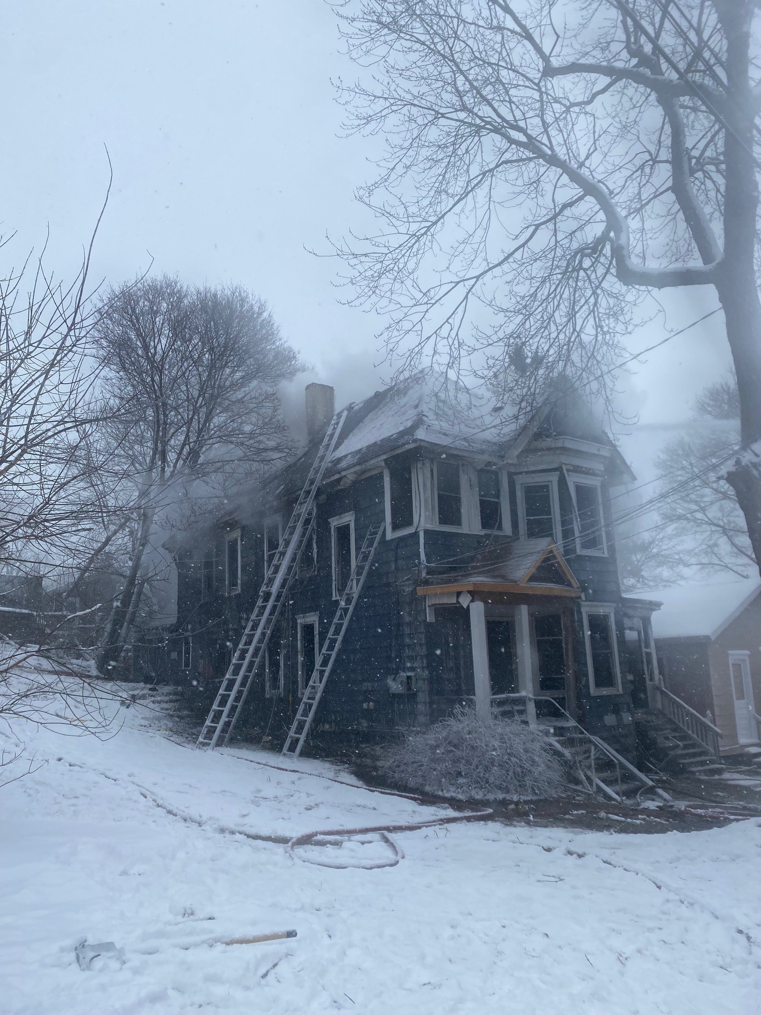 The roof and chimney collapsed into the home and the first and second floors now have severe fire, smoke and water damage.