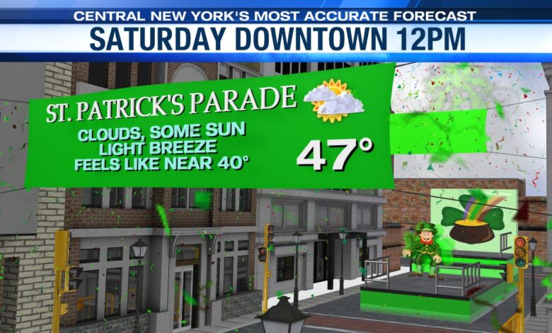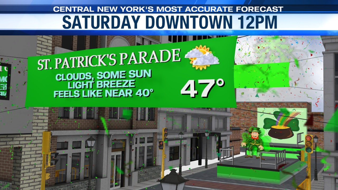 We’ve got some good news for Saturday if you are headed to the St. Patrick’s Parade in downtown Syracuse. First, conditions should be dry. While a mostly cloudy sky is expected leading up to the start of the parade at noon, we also think some sunny breaks occur during the parade.