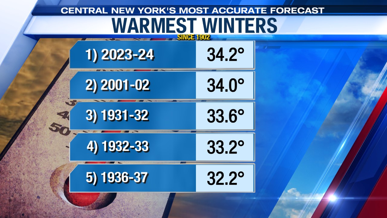 Certainly, you can consider climate change a culprit as there has been a recent trend for warmer winters in Syracuse. Just look at the rankings of our last few winters: