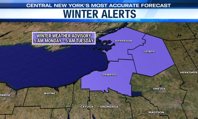 The focal point for developing lake effect snow showers Monday through Tuesday morning will be east of Lake Ontario, particularly for the Tug Hill Plateau. A Winter Weather Advisory is in effect for the counties east of Lake Ontario from Monday through 5 a.m. on Tuesday.