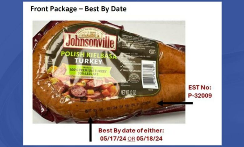 The 12-ounce vacuum-packed packages contain one piece of “Johnsonville POLISH KIELBASA TURKEY,” per the label. The sausage has best-by dates of May 17, 2024 and May 18, 2024. Recalled products also bear the establishment number “P-32009” printed on the side of the packaging.