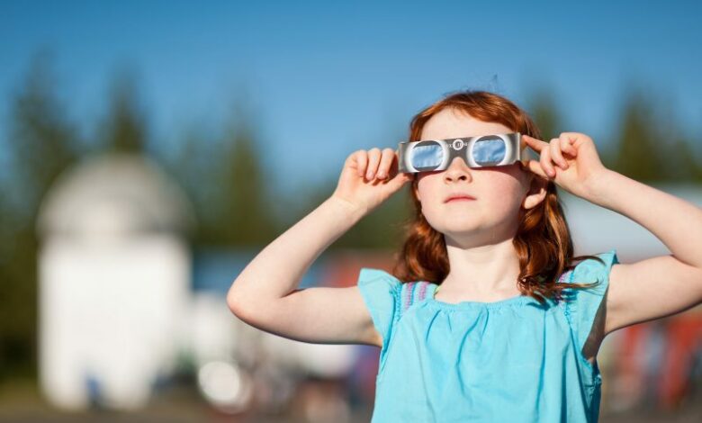 During the solar eclipse, the moon will move across the sun, covering the light and making the sky look dark. Once the sun is covered completely, or under totality, it’s OK to look at the sky, but before and after the eclipse, you should wear eclipse glasses to avoid eye damage.
