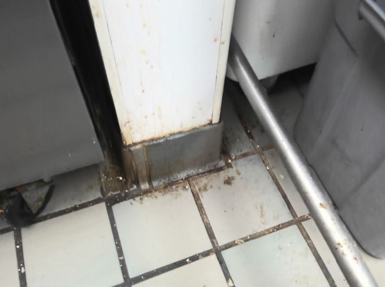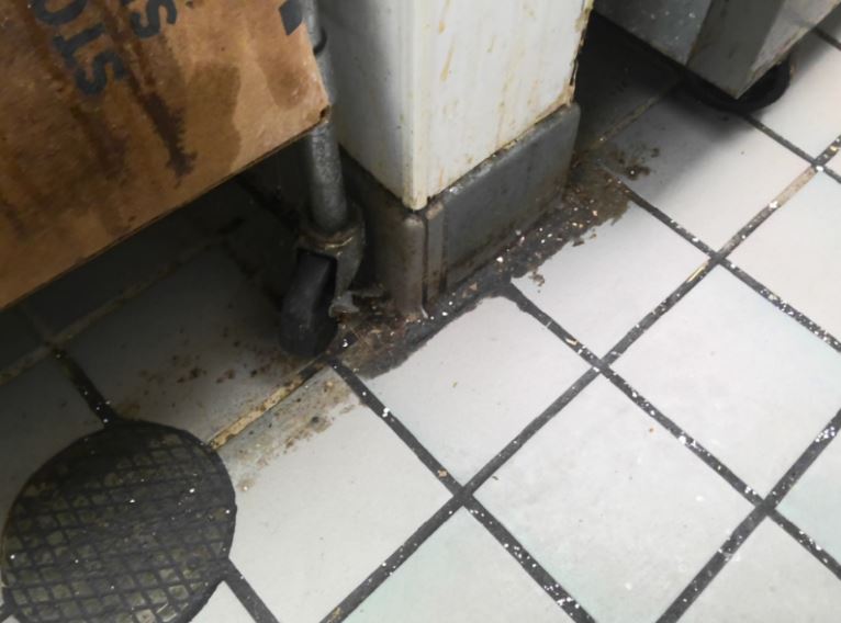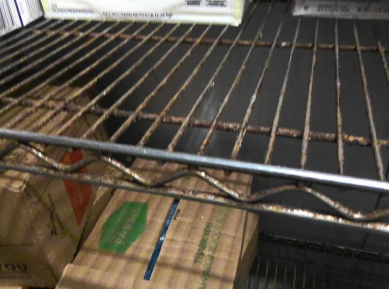 Improper cleaning, washing, and sanitizing of equipment and utensils: The inspector noted that most wire racks in the kitchen and the interiors of the drawers on the 6 draw prep table weren’t clean and had food soil. The bottom shelf of the cookline prep cooler also wasn’t clean and had food soil as well as the exterior of bulk bins holding grits and breading.