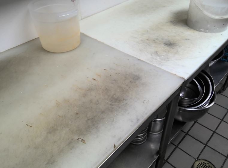 Improper cleaning, washing, and sanitizing of equipment and utensils: The inspector noted the ice slide inside the ice machine had mildew-like soil and the exterior of the ice machine door wasn’t clean and had food soil on it. The back of the meat slicer blade and blade guard also weren’t clean and had dried food soil.