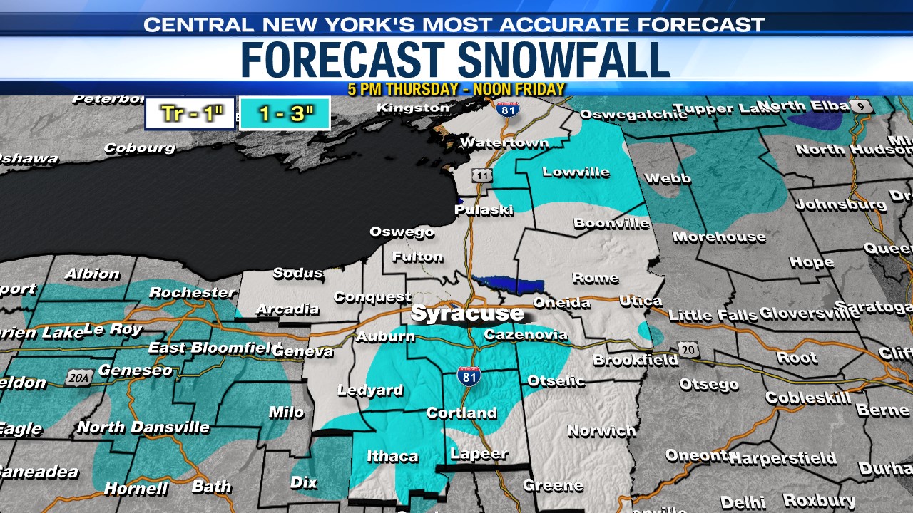 An additional coating to an inch of snow is possible for many spots Thursday night into the start of Friday mainly on grassy surfaces. 1 to 3 inches is possible across higher terrain areas like the hills south of Syracuse and the Tug Hill Plateau.
