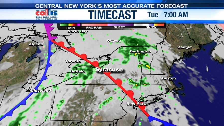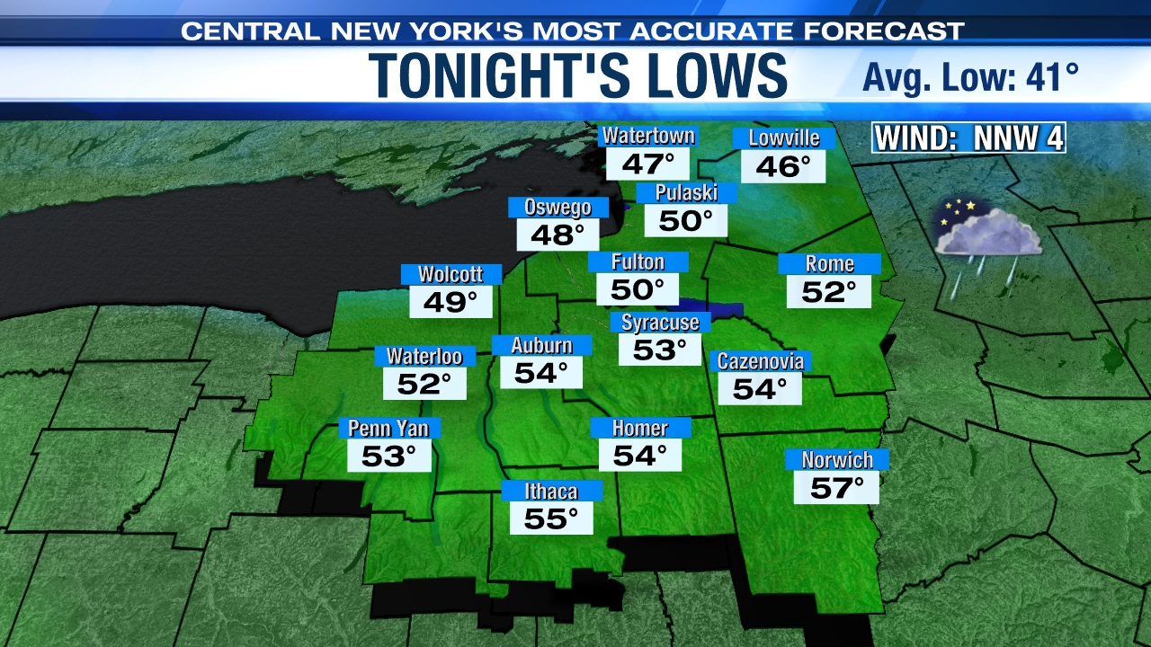 A few morning showers will give way to a mix of sun and clouds. Even though cooler air will be coming out of the north, the developing afternoon sun still helps us warm into the low to mid 70s to start the week, while cooler 60s are felt east of Lake Ontario.