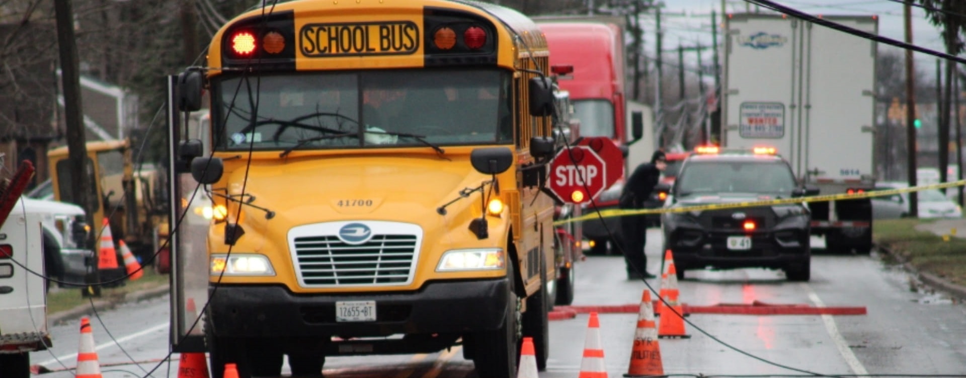 Utica Police say a tractor-trailer hit a pole, which caused the lines to land on the bus and another car.