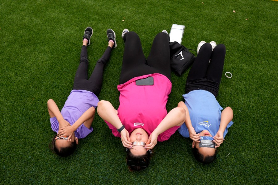 Mackenzie Trumbull, left, and Kathy Trumbull pose for a picture as they gather to watch as the moon partially covers the sun during a total solar eclipse, as seen from at National Mall in Washington, Monday, April 8, 2024. (AP Photo/Jose Luis Magana)