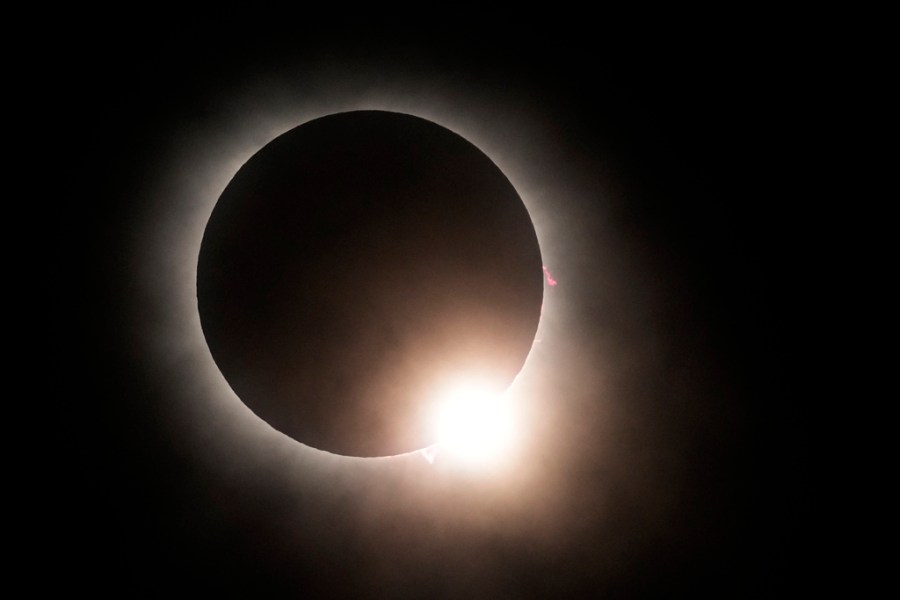 The moon covers the sun during a total solar eclipse, as seen from Bishop’s University in Sherbrooke, Quebec, Monday, April 8, 2024. (AP Photo/Mark Schiefelbein)
