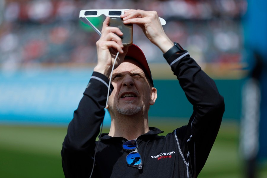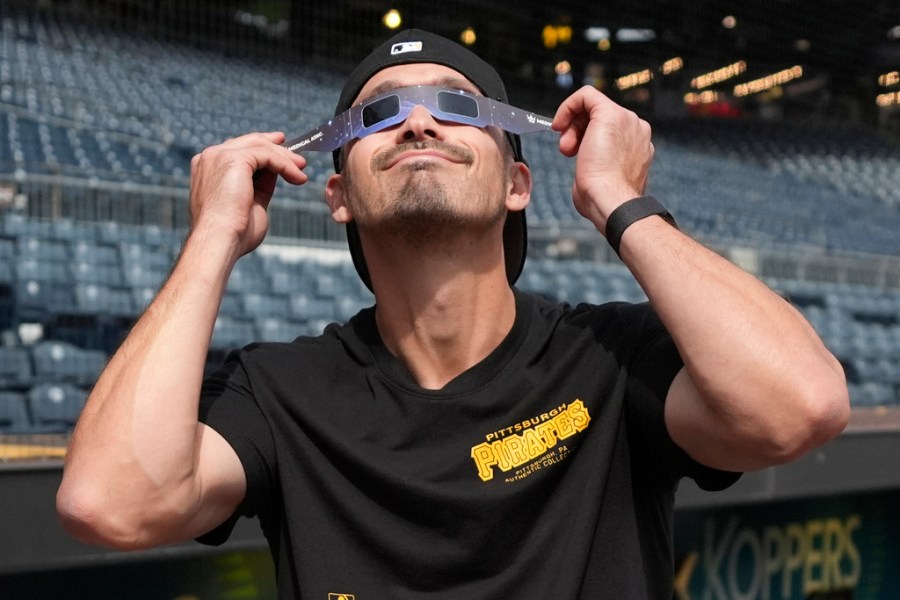 Pittsburgh Pirates’ Bryan Reynolds views the solar eclipse before a baseball game against the Detroit Tigers in Pittsburgh, Monday, April 8, 2024. (AP Photo/Gene J. Puskar)