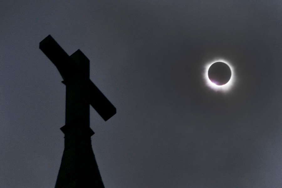 The moon partially covers the sun during a total solar eclipse, as seen below a cross atop the New Sweden Evangelical Lutheran Church steeple Monday, April 8, 2024, in Manor, Texas. (AP Photo/Charles Rex Arbogast)