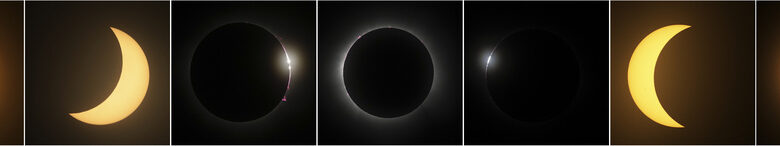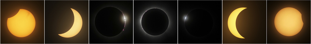 This combination of photos shows the path of the moon, from right to left, during a total solar eclipse, seen from Mazatlan, Mexico, Monday, April 8, 2024. (AP Photo/Fernando Llano)