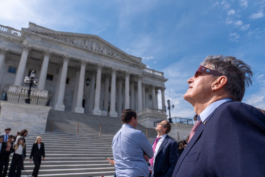 Sen. Joe Manchin, D-W.Va., wears eclipse glasses as he views the moon partially covering the sun during a total solar eclipse, in front of the U.S. Senate on Capitol Hill, Monday, April 8, 2024, in Washington. (AP Photo/Alex Brandon)