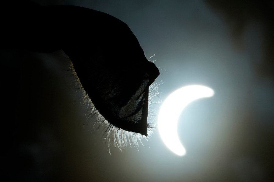 Yurem Rodriquez watches as the moon partially covers the sun during a total solar eclipse, as seen from Eagle Pass, Texas, Monday, April 8, 2024. (AP Photo/Eric Gay)