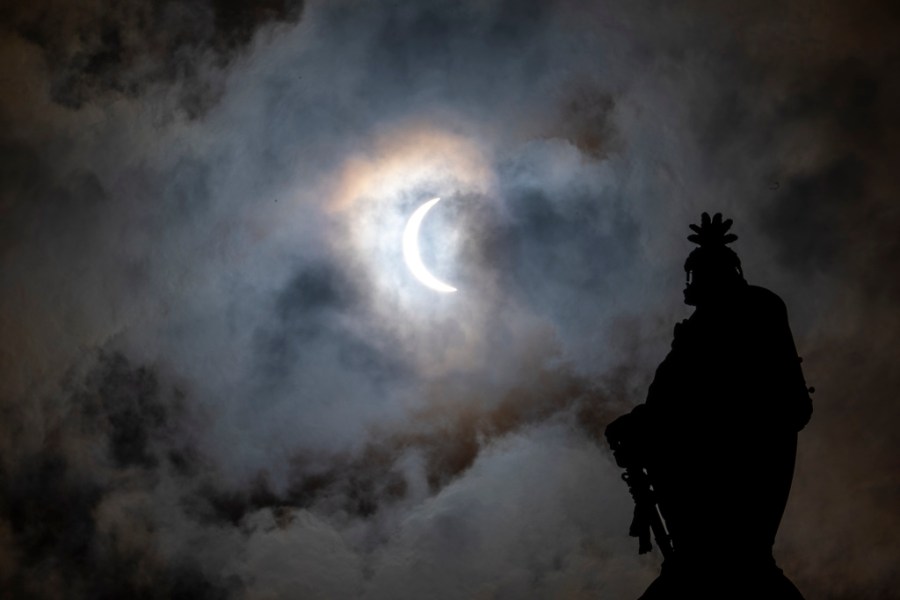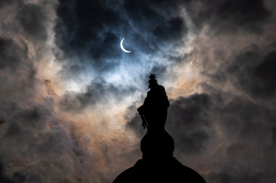 The Statue of Freedom on top of the U.S. Capitol stands as the moon partially covers the sun during a total solar eclipse, as seen from Capitol Hill, Monday, April 8, 2024, in Washington. (AP Photo/Alex Brandon)