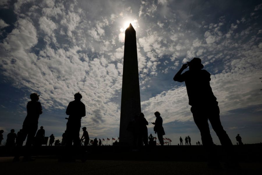 The solar eclipse is seen above the Washington Monument on April 08, 2024 in Washington, DC. People have traveled to areas across North America that are in the “path of totality” in order to experience the eclipse today. The next total solar eclipse that can be seen from a large part of North America won’t happen until 2044. (Photo by Chip Somodevilla/Getty Images)