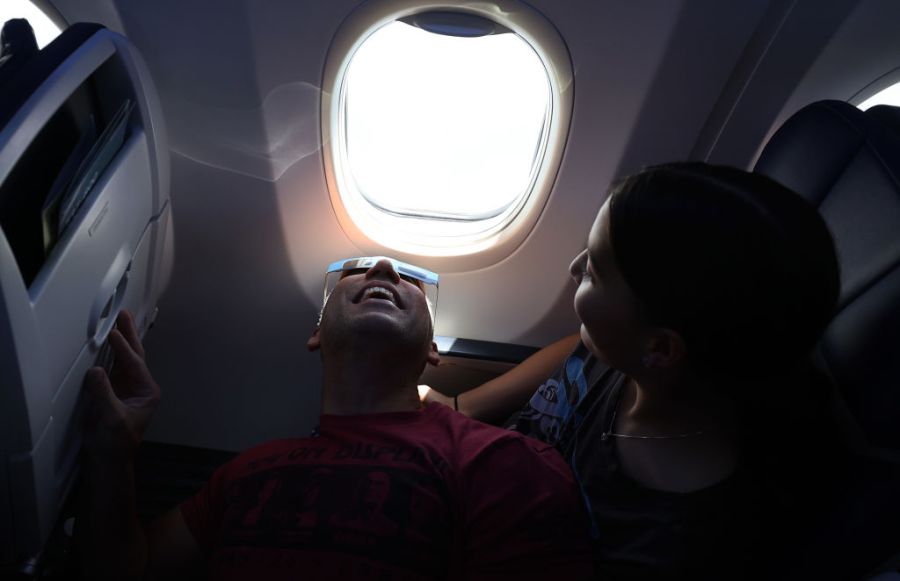 Jose Noble lays on his daughter Alayna’s lap to try and catch a glimpse of a solar eclipse as the plane passes through the path of totality during a Southwest flight 1252 from Dallas, Texas to Pittsburgh, Pennsylvania on April 08, 2024 in flight to Pittsburgh, Pennsylvania. Millions of people have flocked to areas across North America that are in the “path of totality” in order to experience a total solar eclipse. During the event, the moon will pass in between the sun and the Earth, appearing to block the sun. (Photo by Justin Sullivan/Getty Images)