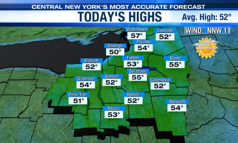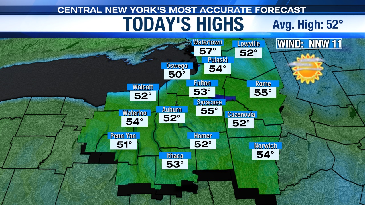 Along with more sunshine returning on Sunday, highs climb to more seasonable levels in the low to mid 50s for all, except up near the Lake Ontario shoreline and hills where readings likely don’t exceed the upper 40s to around 50.