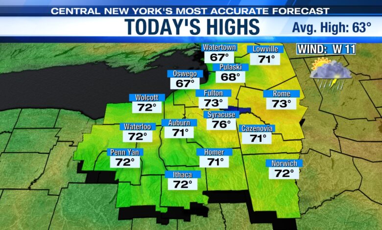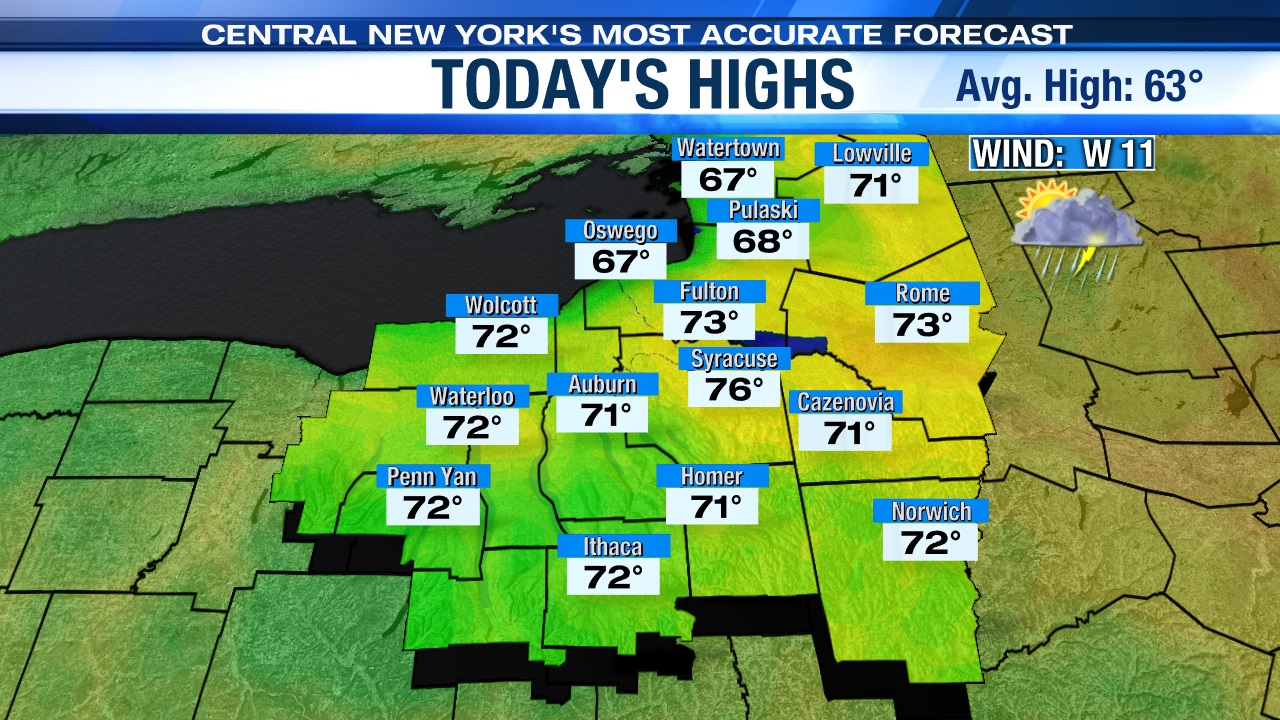 A frontal system and low pressure in the Great Lakes region approach central New York throughout the morning into the afternoon on Tuesday. Showers and storms will develop and highs will reach the mid-70s.