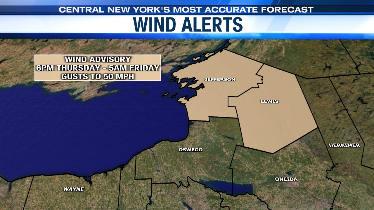 While it is breezy tonight, the best chance for some damaging wind gusts is over Lewis and Jefferson counties where a Wind Advisory is in effect until just before sunrise Friday.