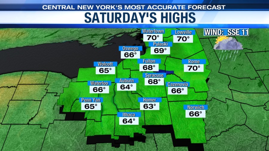 More showers return in the afternoon Wednesday off of a warm front with a chance of a thunderstorm south of Syracuse as well. Highs on Wednesday should be mild near the mid-70s.