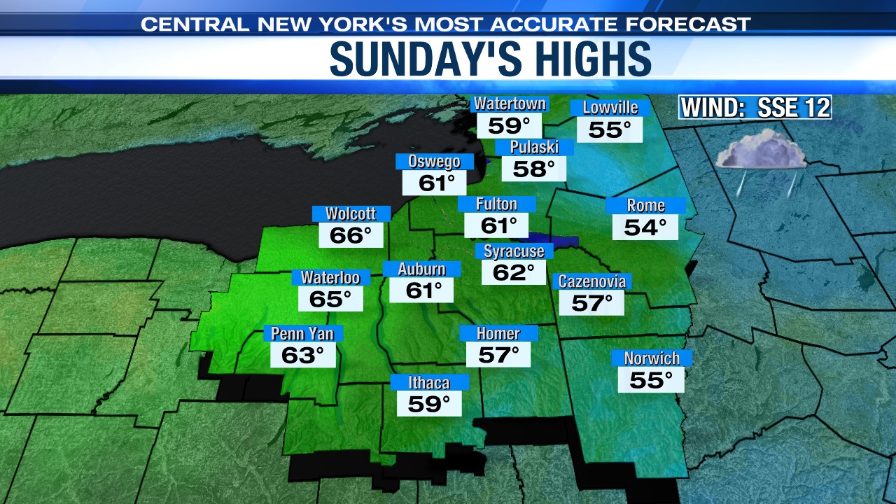 An unsettled pattern of showers will begin Wednesday and last through the upcoming work week. The first area of low pressure will arrive Tuesday night bringing showers through central New York. As this disturbance lifts north, Wednesday afternoon should dry out before showers return for both Thursday and Friday. These showers are from another storm system that will track eastward. By Friday, the center of the storm system will be to our east, which will then provide a cooler northwesterly wind for Friday. This is why high temperatures Friday will be cooler in the mid 60s.