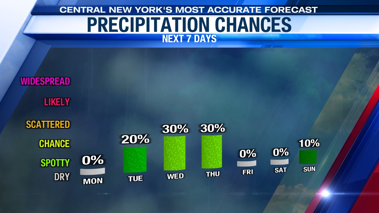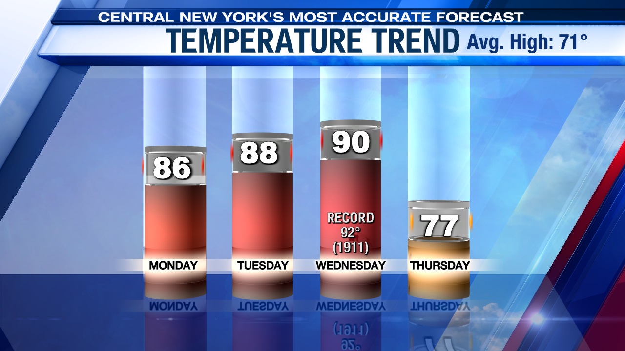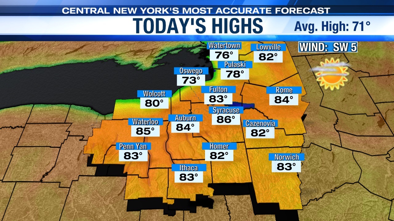 A developing southwesterly wind (typically a warm wind for Syracuse) helps push temperatures into the mid to upper 80s through Tuesday.