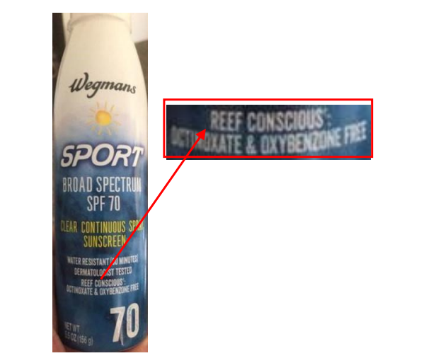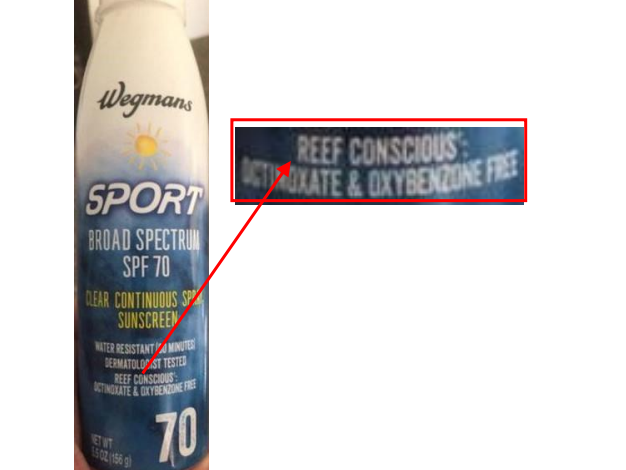 According to the lawsuit, Wegman’s store brand sunscreen says on the bottle “Reef Conscious,” which means the product is safe for reef ecosystems. The bottle also says “Formula is compliant with Hawaii SB2571,” a law in Hawaii that bans the sale of products with oxybenzone or octinoxate.