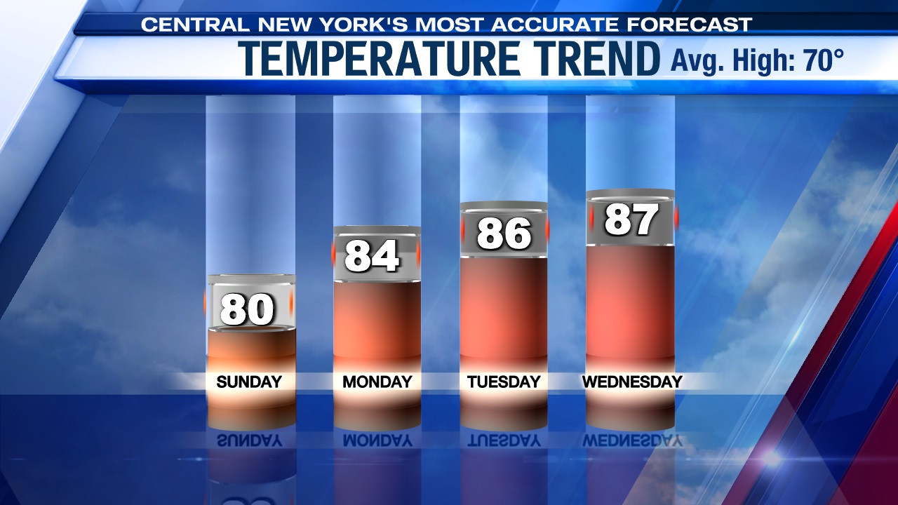 It looks to be warm through midweek with a good deal of sun and the help of a southwesterly wind (typically a warm wind for Syracuse). This should help push temperatures into the low to mid 80s through Tuesday, and if we stay mainly dry with enough sun Wednesday, we could warm into the upper 80s to near 90!