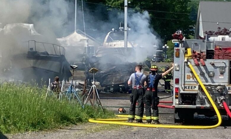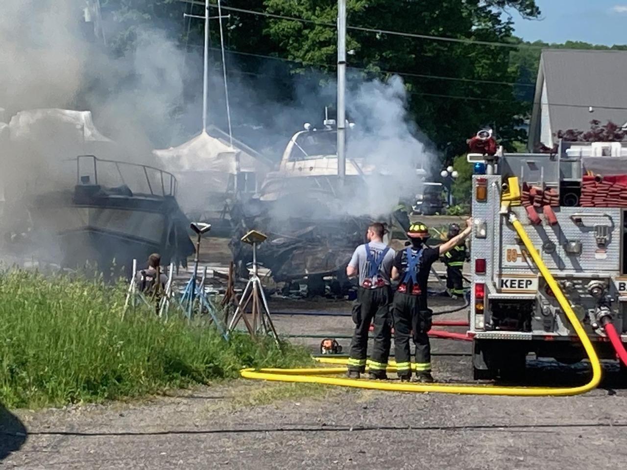 Wayne County Sheriff’s vehicles can be seen at the marina as firefighters are seen spraying hoses toward some of the boats. Smoke is also seen in the area.