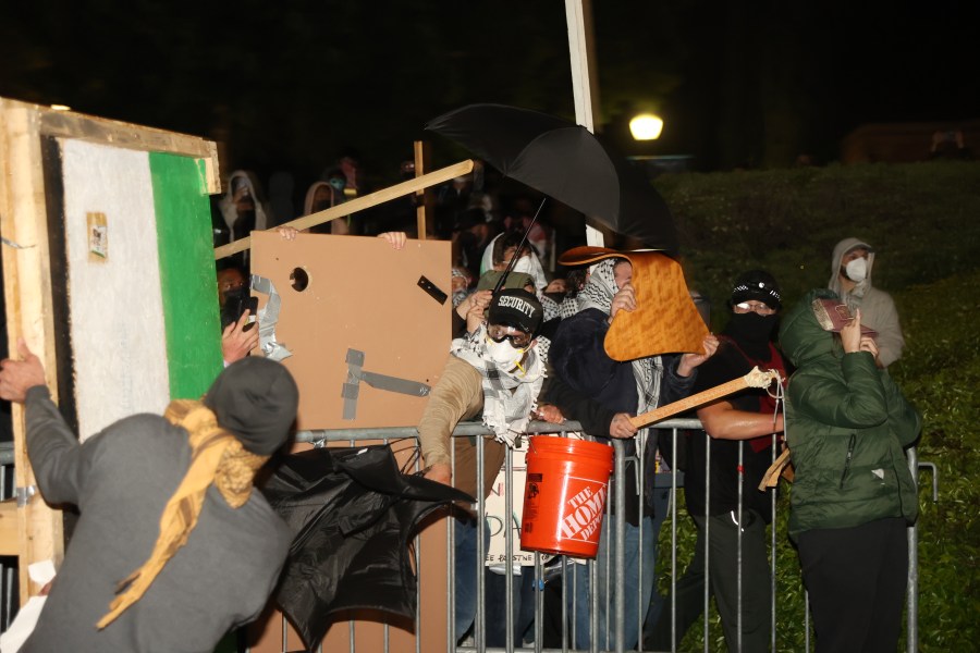 Police methodically ripped apart the encampment’s barricade of plywood, pallets, metal fences and trash dumpsters and made an opening toward dozens of tents of demonstrators. Police also began to pull down canopies and tents. Demonstrators held umbrellas like shields as they faced off with dozens of officers.