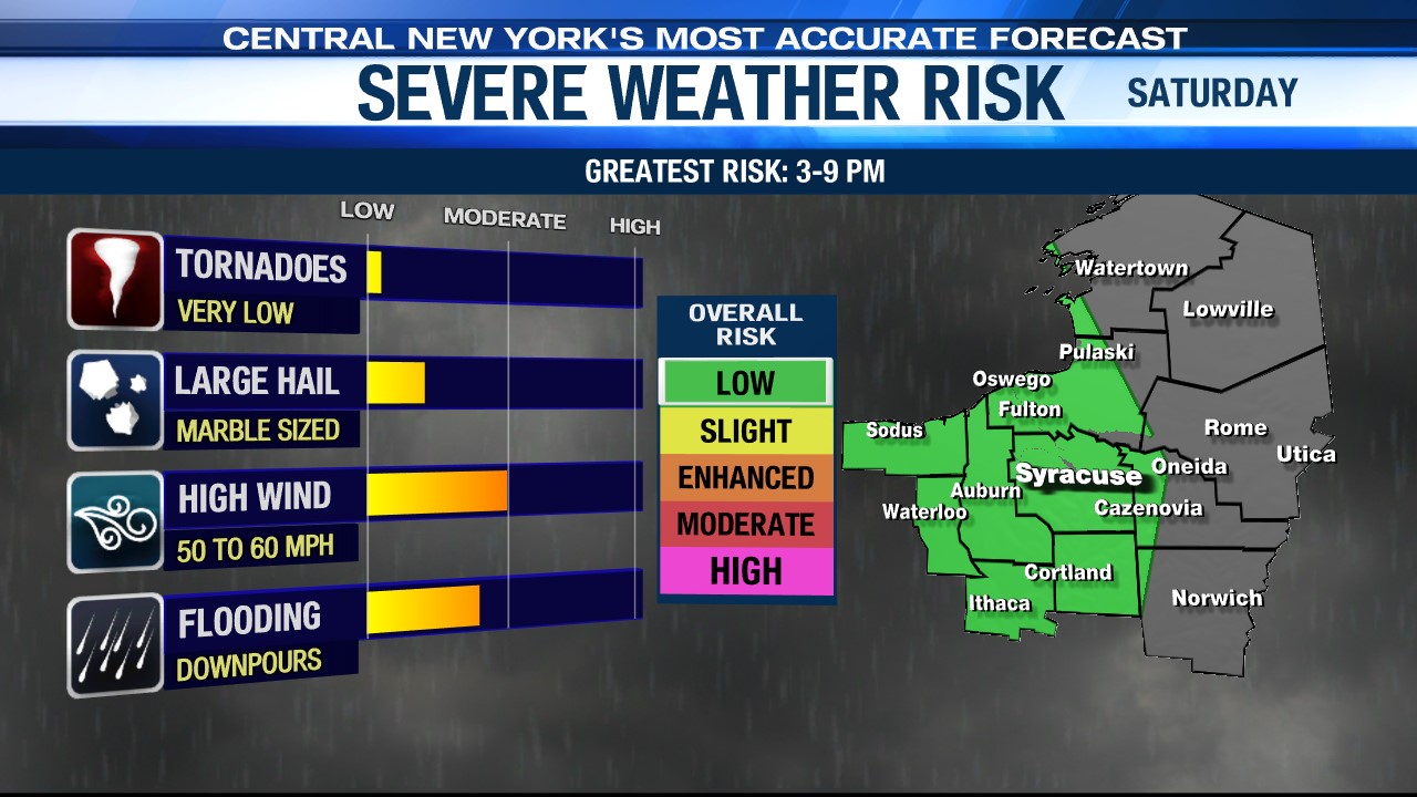 While we do have some showers and storms in the forecast for Saturday, they likely will not arrive until later in the day after 2 or 3 p.m. They would sweep east of central New York close to sunset.