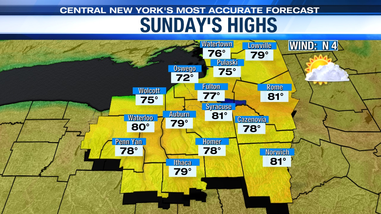 High temperatures once again are above average topping out close to 80 degrees! Perfect for just about any outdoor activities, including the Watchfire at the Fairgrounds Sunday evening! Click here for the boating and swimming weather Sunday.
