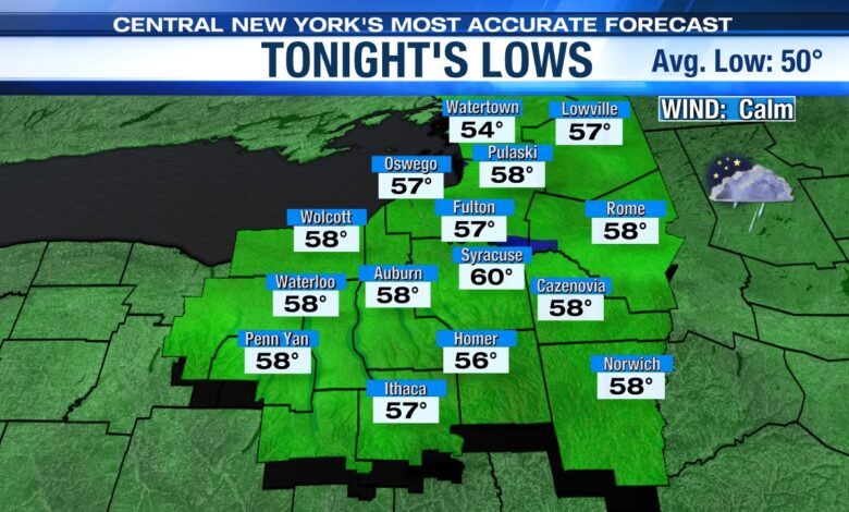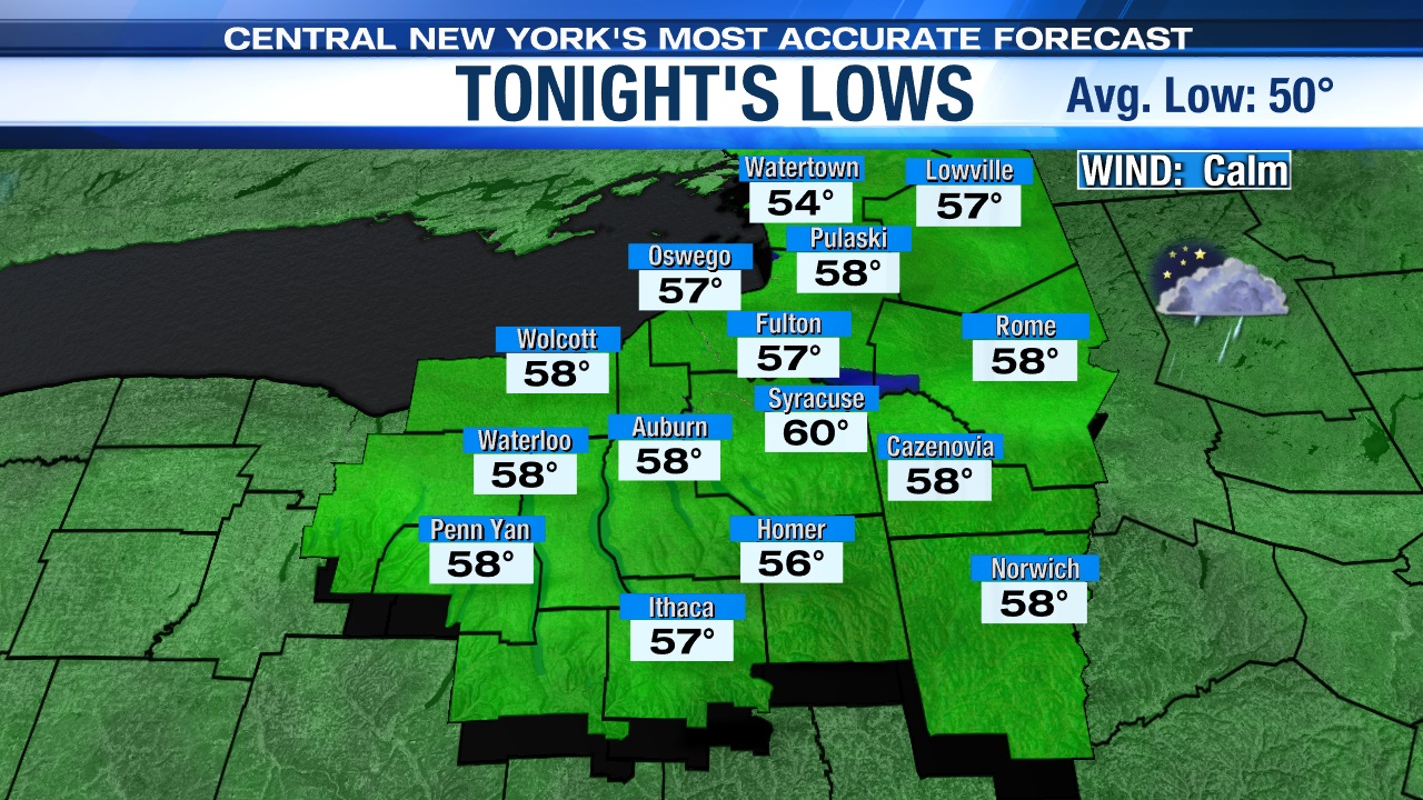 Temperatures cool into the 50s and low 60s with areas of fog under a partly cloudy sky as the Saturday evening cold front slides out of CNY and allows high pressure to settle in overnight.