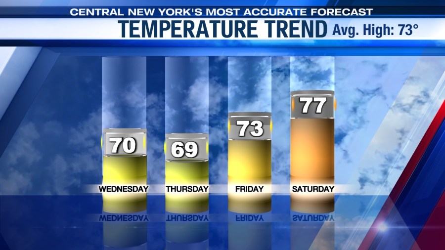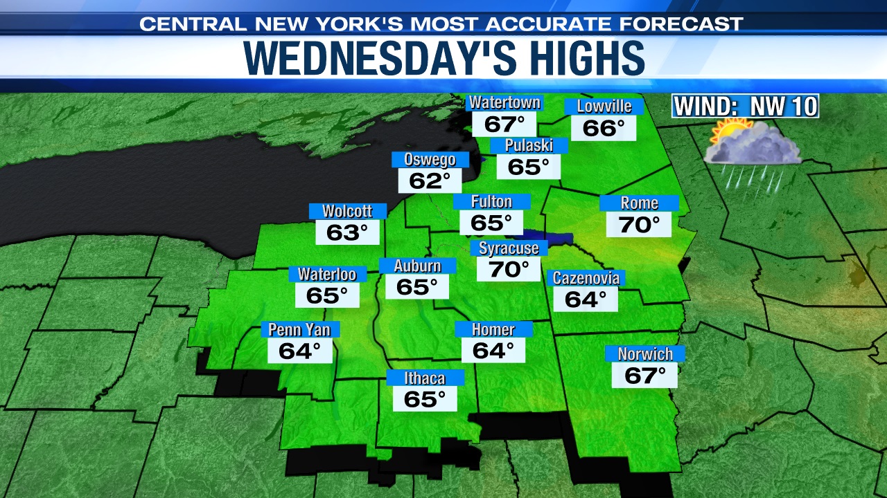 After reaching 72° in Syracuse on Tuesday, it’s even cooler and less humid Wednesday and Thursday. Intervals of sun develop Wednesday, especially Syracuse north bound in the afternoon, and more in the way of sun is expected Thursday.