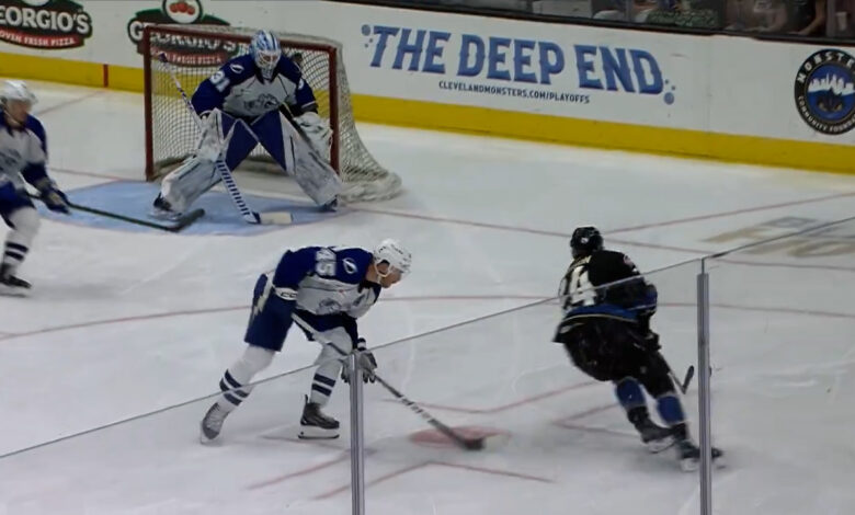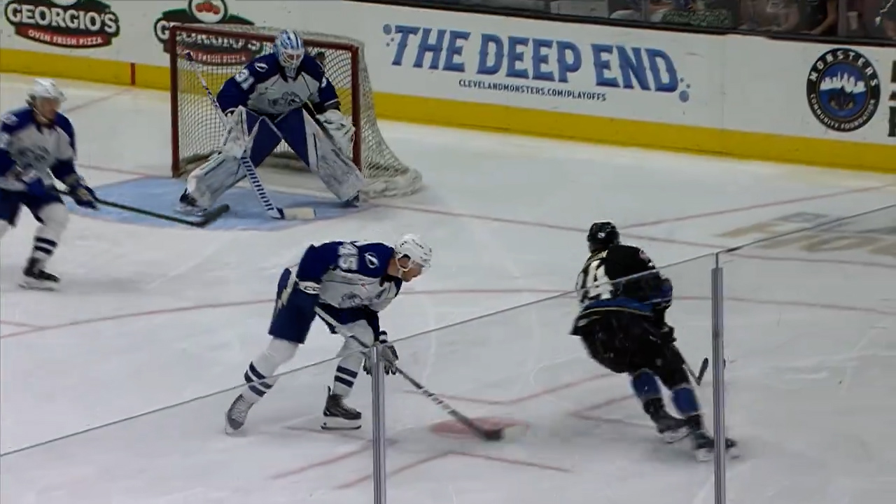 Less than five minutes into the third period, Cleveland’s Justin Pearson broke a scoreless game, scoring a shorthanded goal to lift the Monsters to a 1-0 Game One win over Syracuse.