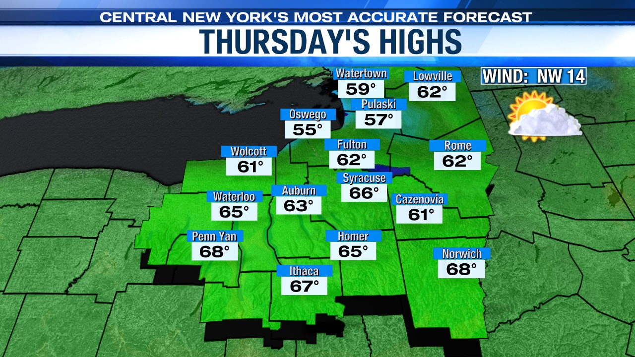 Some more clouds work in tonight with a shower or two possible mainly north of Syracuse as another weak occluded front sweeps through.