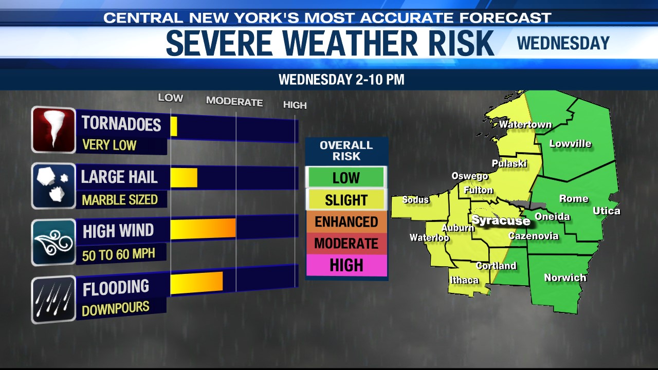 The Storm Prediction Center has parts of CNY under a Slight Risk of severe weather, meaning a level 2 out of 5 threat of strong and severe thunderstorms. We must be vigilant of storms that could produce gusty damaging winds 50-60 mph, hail, and heavy downpours between 2-10 pm Wednesday. The tornado threat is very low at this time.