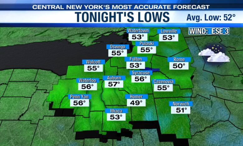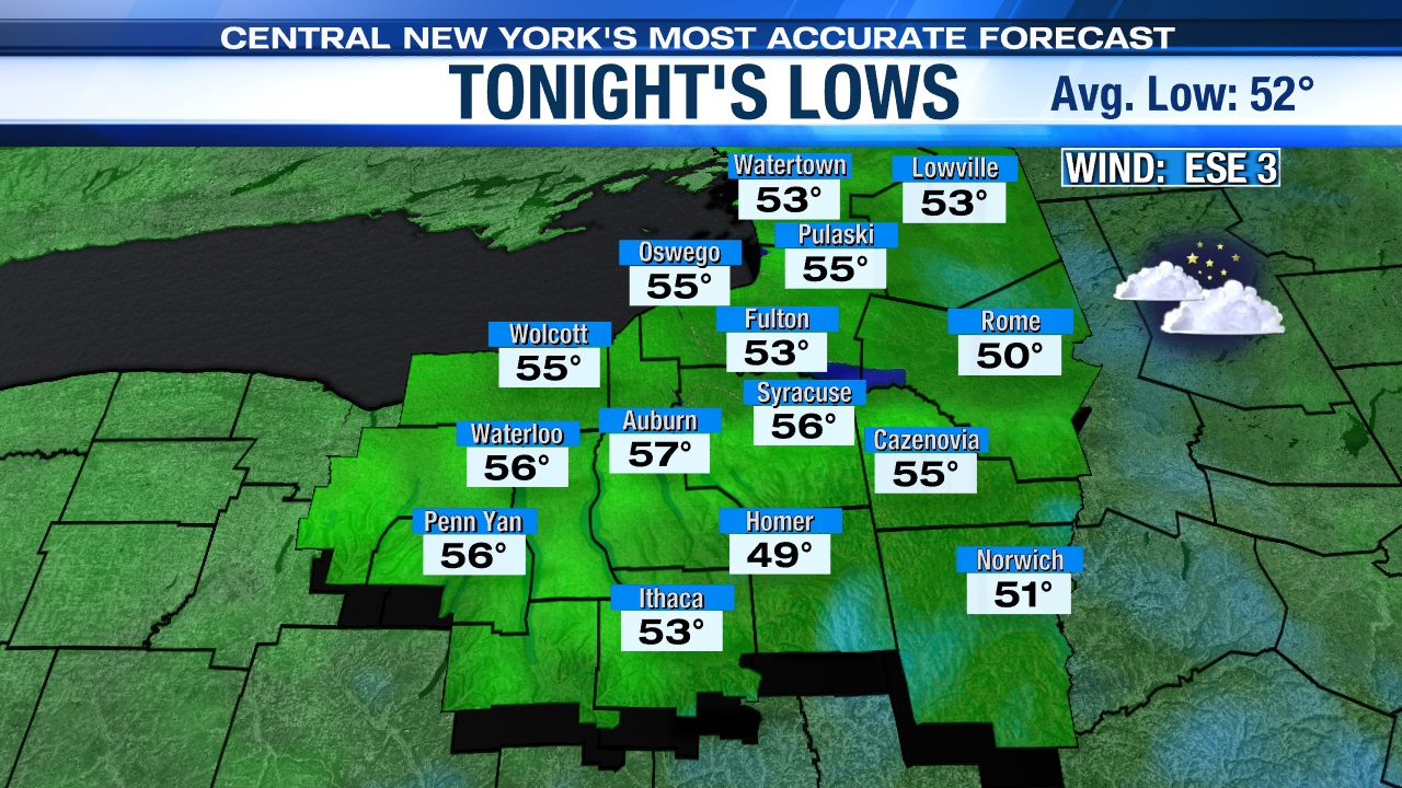 High and mid-level clouds will skirt the sky tonight with lows not as cool as it’s been the last several nights. Lows will be in the mid-50s for the majority.