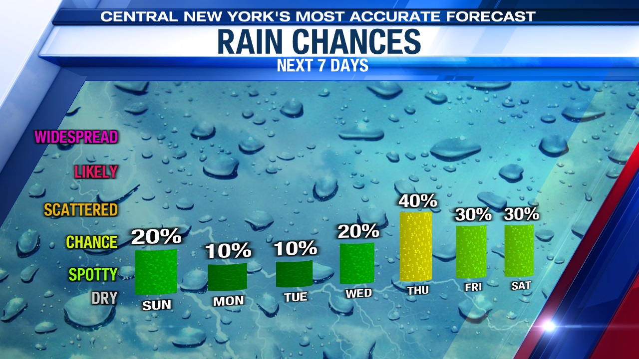 The best chance for showers for the weekend looks to come later Sunday afternoon and evening. The culprit is a weakening area of low pressure coming out of the Southern Plains. This area of low pressure moves northeast with showers and storms but continues to weaken as the system runs into drier air over us as it heads into the Northeast on Sunday. Despite the dry air weakening the low, we still think at least a few of these showers survive the trip into Central New York Sunday afternoon and evening.