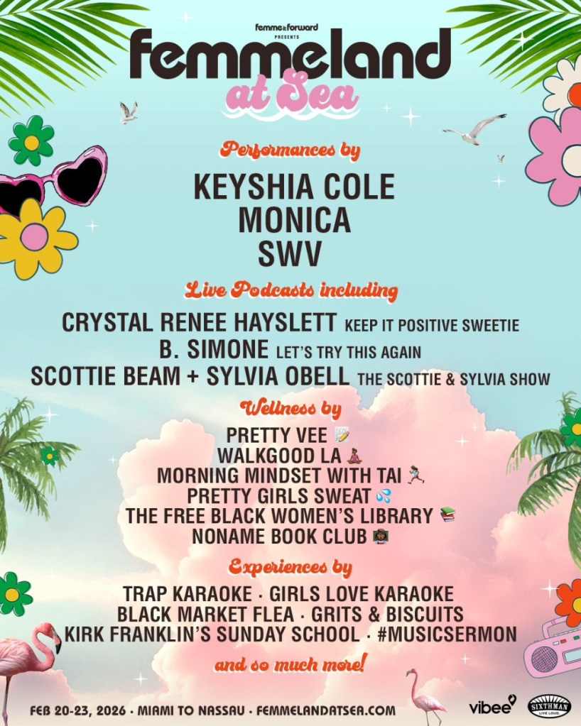 Keyshia Cole, Monica and SWV are the performing stars enlisted to headline Femme It Forward’s first-ever cruise, Billboard can exclusively reveal. Presented in association with Sixthman and Vibee, Femmeland at Sea will sail from Miami to Nassau, Bahamas between Feb. 20-23, 2026.